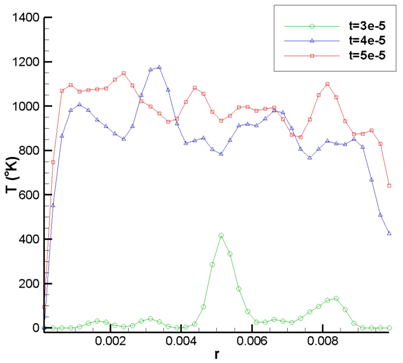 Variation of temperature and pressure on the surface of cylinder’s cross-section are considered. Figure 10 indicates temperature of surface along the radius of cross-section for different time steps. At the time step of , temperature commence to fluctuate, because of arriving the gas molecules. In the following times, temperature drastically increased, up to more than 1000°K. Low temperature near the symmetry axis is due to lack of enough particles in the very small cells which are located there. This intense increase in temperature shows importance of the study of plume flows’ interaction with sensitive segments of spacecrafts and satellites.