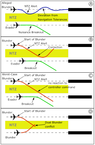 During parallel approaches, a blunder should induce a breakout maneuver of an aircraft operating on the adjacent approach track, this one then following the published missed approach procedure. This scheme enforces safety at a minimal cost of capacity. Since aircraft are subjected to navigational tolerances, NTZ alerts may be triggered by aircraft deviating from but autonomously returning to their approach track. Nevertheless, the (automatically triggered) NTZ alert requires ATC to ‘break’ the adjacent aircraft ‘out’ of the approach. This is called a nuisance breakout in the sense of a false positive alert (see scenario A in (Figure 2). The frequency of such events is called nuisance breakout rate (NBR) and forms a (lost) capacity measure. Fixing a general NBR target is however unrealistic since it depends on many factors, e.g., on the traffic mix and the given runway spacing. To give indications about NBR estimates, we find in Massimini7 that the NBR estimated is considerably below 5% of all approaches. In Mc Cartor & Ladecky,12 aircraft performing an RNP 0.3 (non-precision) approach are observed to cause similar nuisance breakouts 2-4% of the time.