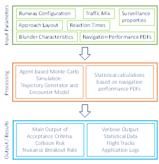 Depending on the airport runway operation mode (segregated or mixed), individual requirements have been established by ICAO to assure safe operations. However, these safety measures are somehow “static” and do not foresee specific adjustments to local conditions because no explicit cause-to-risk correlations exist in current guidance material except for the final approach segment.5 To overcome this lack of cause-and-effect reasoning, the present project investigates pair wise aircraft collision risk modeling (CRM), also explicitly taking controllers and flight crews into account, modelled mathematically as so-called agents. The case study assumes radar vectoring towards the final ILS approach, laterally intercepting localizer (LOC) and subsequently the glide slope (G/S) until the aircraft has crossed the runway threshold. The following four sections summarize and present (in Section 4) the results of a literature review regarding current regulations and the scientific state-of-the-art knowledge in the field of assessing operational safety during independent parallel approach procedures. We make conclusions about input parameters of the model and summarize on CRM Acceptance Criteria as the output of the model. In Section 5, we specify how the fast-time model is integrated into the overall architecture and explain how the agents are modeled. In Section 6, we transfer the specification into software in order to calculate safety and capacity metrics (i.e., probability of separation infringements and the nuisance breakout rates as detailed in Section 4.D) for various scenarios depicting traffic, runway/airspace layout and agent behavior (i.e., procedures and hazards as detailed in Section 7.A). In Section 7, we discuss the model verification concept and the results gained.