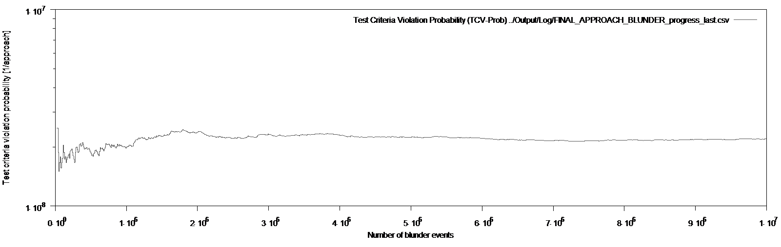 Using these settings, multiple simulations, initialized with individual random ‘seed’ values, were conducted. Figure 5 visualizes the development of resulting probability over an increasing number of simulated blunder-evader pairings. The results stabilize at a probability of around TCV per approach, which is close to the ICAO value of (one TCV per 56 million approaches).15 The remaining differences do result from implementation details (e.g. clothoid) and model parameterization (e.g. ILS deviations). Especially, we found high sensitivity to TCV probability towards the final approach length, which was set to 10 resp. 13.5NM for both runways to allow for immediate blundering towards NTZ. When applying 10NM for both runways, the probability drops significantly down to around TCV per approach. This ILS specific effect is subject to further research.