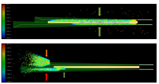 The ‘novel’ safety case now covers additionally the LOC intercept including the additional hazard of weak interception due to human error such as e.g., flight guidance mode-confusion. The model handles such events identically to those on final approach, with the difference that the blunder initiation is linked to the nominal intercept point and the ‘blunder’ heading is assumed to be already reached. In contrast to the ‘classic’ scenario, the NTZ, extending outwards until vertical separation is no longer granted,15 does not cover that airspace entirely. Instead, vertical separation set to 1000ft. between left and right approach safeguards the intercept procedure. Following the stated assumptions, proactive controller interventions (without NTZ alert) are not considered. This is a rather weak assumption from reality. Therefore, the current agent behavior represents a conservative (static & worst-case) safety consideration. The resulting points of closest approach (slant distance color-coded) are shown in Figure 6.