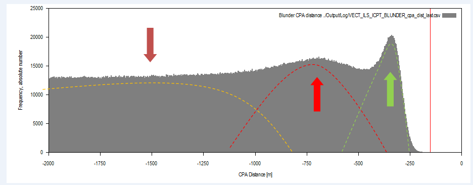 Figure 7 The ‘novel’ safety case: blunders on the final approach, density of aircraft pair slant distance with indicated TCV (red line, top) and therory of underlying distributions (colored arrows and dashed lines matching Figure 6.