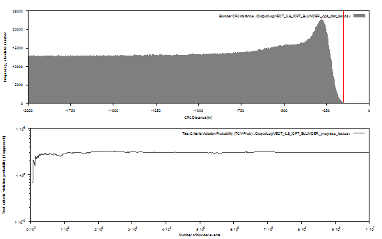 Figure 8 Modified ‘novel’ safety case with reduced vertical separation (800 ft.), density of aircraft pair slant distance with indicated TCV (red line, top), development of probability over the number of simulated blunder events. (Bottom)