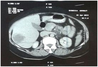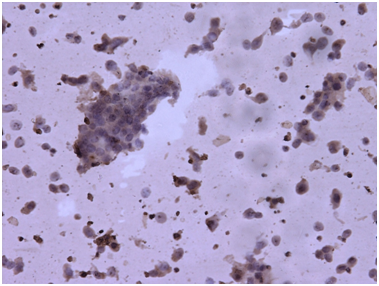We report a case of 62 years female menopausal for 17 years operated for endometrial adenocarcinoma grade II (moderately differentiated). She underwent total abdominal hysterectomy & bilateral salpingoopherectomy. Then she received 35 cycles of brachytherapy. One year later she consulted for a cutaneous mass measuring 4x4cm, firm too hard, fixed at anterior left shoulder. FNAC was performed along with Liquid based cytology. Smears examined were cellular comprising neoplastic cells arranged in groups, sheets, acinar structures and dispersed singly having round to oval, moderately pleomorphic nuclei coarse nuclear chromatin, prominent nucleoli and moderately abundant cytoplasm which is vacuolated at places. Keeping in view previous histopathological diagnosis of endometrioid adenocarcinoma diagnosis of metastasis possibly from endometrial adenocarcinoma was made. Liquid based cytology also reveals groups, clusters & acini of these neoplastic cells in a relatively clean background. Immunocytochemistry (ICC) for Progesterone Receptor (PR) was negative on LBC smears suggesting poor prognosis. Then patient was further investigated and Ultrasonography (USG) abdomen, Contrast enhanced chest tomography (CECT) chest, abdomen & pelvis & haematological tests were performed. USG show hypoechoiclesion with areas of cavitation right lobe revealing metastasis. CECT show multiple heterogeneously enhancing hypodense lesion in right lobe of liver (metastasis), mediastinal & retroperitoneal lymphadenopathy, metastasis right lobe of lung & enhancing mass pre & paraaortic region. Based on FNAC report and clinical investigatory correlation patient was started with chemotherapy & radiotherapy (Figures 1-5).