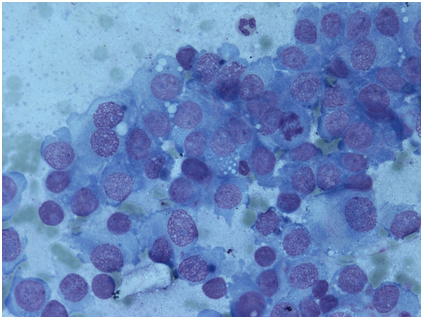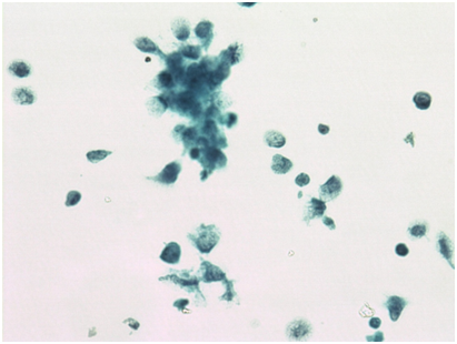 Cutaneous metastases from internal carcinomas are relatively rare with reported incidence of 0.7-0.9%.3 Breast cancer is most common origin of skin metastasis in women & lung in men.4 Skin metastases from endometrial adenocarcinoma are extremely rare with a report prevalence of 0.8%.5 In reported cases metastasis from endometrial cancer has been most commonly noted at site of initial surgey or radiotherapy.1 But in our case it shows unusual presentation with distant involvement of skin. Metastasis to skin is usually confined to subcutaneous tissue & patient present with rapidly developing nodules or discrete movable painless masses.6 In our case patient presented with cutaneous painless mass. So in patients presenting with cutaneous lesions differential diagnosis of metastasis from underlying internal malignancy should also be kept. Carcinoma metastasize to skin by different mechanisms including direct extension, lymphatic or hematogenous spread. Direct extension involves tumour at incisional, trochar or drain site.2 Subcutaneous nodule along with lung and lymph nodes involvement suggests widespread hematogenous dissemination. Cutaneous metastasis of endometrial carcinoma reflects poor prognosis with mean life expectancy of 4month to 12 month.5 FNAC not only helps in early diagnosis & prompt initial evaluation & treatment of cutaneous metastasis with known primary but also offers an accurate & non invasive method for diagnosis of metastasis.7 Further use of LBC helps in diagnosing primary with help of ICC & in some cases prognosis of tumour.8 In most of patients subcutaneous metastasis reveals a terminal stage of illness so using a non invasive method for diagnosis or exclusion of metastasis is crucial. FNAC is preferred over biopsy for quick diagnosis especially in patients who are suffering debilitating diseases.9 Fine-needle aspiration is a diagnostic procedure used to investigate lumps or masses. In this technique, a thin (23-25 gauge), hollow needleis inserted into the mass for sampling of cells that, after being stained, will be examined under a microscope (biopsy). The sampling and biopsy considered together are called fine-needle aspiration biopsy (FNAB) or fine-needle aspiration cytology (FNAC) (the latter to emphasize that any aspiration biopsy involves cytopathology not histopathology). Fine-needle aspiration biopsies are very safe, minor surgical procedures. In our case the lady presented with cutaneous swelling was debilitated and terminally ill. So we perform FNAC. Based on FNAC, clinical findings & previous histopathology report diagnosis of metastasis from endometrial carcinoma was made. No biopsy was performed. PR status was negative on LBC smear revealing further poor prognosis. So FNAC can be used rather than biopsy in such patients’ with cutaneous involvement at terminal stage.