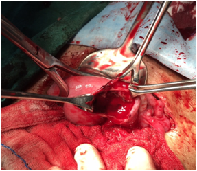 A 25 yrs old P2L2 women came to casuality with history of acute pain abdomen since 1 day. She was referred from some periphery hospital where she was admitted for 1 day and kept on conservative management. The ultrasound report showed complex collection in pelvic cavity around 300cc. in right adnexa and small amount of collection in left adnexa. Her vitals were stable with pulse of 78per min. and blood pressure was 100/60mm of Hg. Her abdomen was soft, non tender and non tense. On per vaginal examination uterus was of normal size, anteverted, cervical motion tenderness was present, bilateral fornices were clear and non tender. She presented on 19th day of her menstrual cycle with her previous cycle was regular. There was no history of any medication or contraceptive use. After 10hrs of observation and conservative management, her abdomen was tense, tender and girth increased. Ultrasound was done and showed bulky right ovary (4.9×3.2cm) with no vascularity suggestive of torsion and mild free fluid in pelvic cavity. The patient was taken for emergency laparotomy in view of ovarian torsion. Intraoperative there was hemoperitoneum of around 500cc with ruptured corpus luteal cyst of right ovary (Figure 1). Right ovarian cystectomy with ovarian reconstruction was done. Tissue was sent for histopathological examination and showed ovarian tissue with areas of hemorrhage.