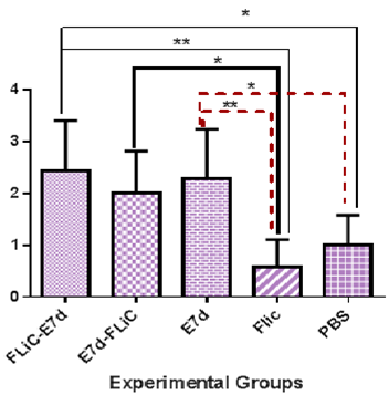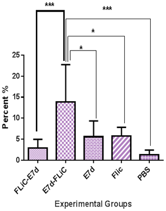 Apoptosis: Evaluation of apoptosis Results shows that immunization with Flic-E7d cause significant increase apoptosis versus control groups (Flic vaccine and PBS) (P=0.0012, P=0.0185 respectively). Also, immunization with E7d-Flic vaccine candidate shows significant increase of apoptosis level versus Flic control group (P=0.0186). Apoptosis level at group received E7d vaccine has increased as compared with PBS and Flic control groups (P=0.0437, P=0.003 respectively). The apoptosis level at Flic-E7d, E7d and E7d-Flic groups shows no significant differences versus each other (p>0.05) (Figure 3).