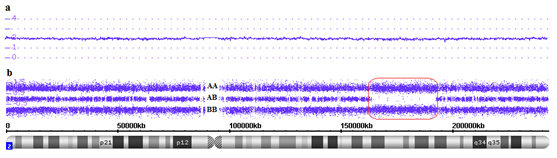 Regions of homozygosity are more abundant in the human genome than previously thought. Homozygosis means that an individual has two copies of one chromosome or chromosome region but both were inherited from the same parent, i.e. these regions have two identical alleles.1 There are many terms to describe regions of homozygosity (eg, absence of heterozygosity, runs of homozygosity, loss of heterozygosity), and each one brings a lightly different meaning. In this work the term long runs of homozygosity (ROHs) was used to describe continuous chromosomes regions that have the same alleles and copy number state of 2. The minimal size of ROHs is generally set around 3 to 10Mb in clinical analyses and 0.5 to 1Mb in population genetic analyses.1,2 Many recessive genetic diseases are associated with parental consanguinity because individuals born into such families typically have ROHs. Detection of ROHs, in and of itself, is not diagnostic of any disease and may be clinically benign. On the other hand, all ROHs regions have the potential to port recessive mutations.1,3,4 Single nucleotide polymorphism (SNP) array method is a technology used to perform copy number analysis and to detect runs of homozygosity in all chromosomes simultaneously. SNP array method uses millions of probes (25-mer oligonucleotides) and has coverage for all chromosomes in high resolution. There are two types of probes: one used to assess genotypes (polymorphic probes) and another for assessing copy number (non-polymorphic probes). For copy number (CN) analysis, through fluorescent probes, patient DNA signal intensity is compared to signal intensity of a set of reference DNAs, indicating whether there is a gain or loss of genetic material (Figure 1A). For genotype analysis, polymorphic probes indicate which SNP is present in a particular chromosome region, the alleles are arbitrarily designated as A for one SNP and B for the other SNP and reveal which of the genotypes (eg, AB, BB or AA) is present along the entire chromosome (Figure 1B).5 To demonstrate the use of SNP array in ROHs detection, we present here a case of parental consanguinity that exemplifies this issue.