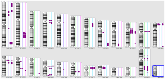 Figure 3 Karyoview (Affymetrix CytoScan® HD Array) showing multiple ROHs regions in S1, S2, S3 and S4 patients (purple bars next to each chromosome ideogram).