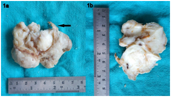 Figure 1 Resected specimen of swelling in zygomatic region showing a partially skin covered multinodular mass (1a). The cut surface of the mass was solid grey white. (1b).