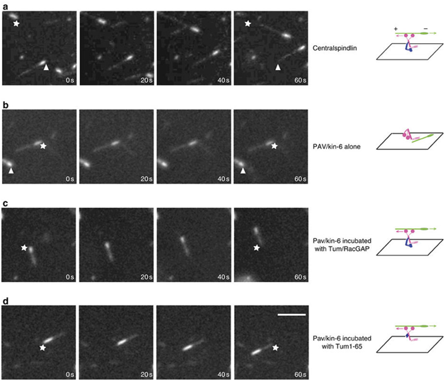 Figure 1 MT gliding assays reveal Tum/RacGAP is required for the motor activity of Pav/Kinesin-6. Assays of MT gliding driven by (A) centralspindlin, (B) Pav/Kinesin-6, (C) Pav/Kinesin-6 incubated in vitro with Tum/RacGAP, (D) Pav/Kinesin-6 incubated in vitro with Tum1-65 fragment. In each row of panels, stars and arrowheads are positioned in the same spot to judge movement. Polarity and direction of movement is indicated by a brighter minus-end. Scale bar 5 micrometers. Figure and description courtesy of Dr. Li Tao.