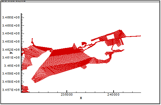 The mesh that represents Edko lake and drain is composed of quadrilateral four sided finite elements as shown in (Figures 2-4). Coordinates of the mesh loops were extracted from image photos and given in UTM coordinate system. The number of elements is 9,585 and the number of nodes is 10,755 nodes. The covered area of the lakes is 7250 Feddans while the drain area is about 250 Feddans giving a total study area of about 7500 Feddans (32,100,000 m2). The lake’s surface area is reported to reach between 5,000 and 11,000 Feddans but most of which are blocked by weeds and contribute very little to the storage capacity of the lake. Therefore, only the active storage area of about 7,250 Feddans is considered in this study, but adding additional area to the active area of the lake is considered in one of the solution scenarios as will be seen later. In this particular scenario the area of the lake reached 10,400 Feddans. The part of Edko drain that is included in the model starts from the Siphon at the intersection of Edko drain with El Mahmodia canal (Km 38.8).