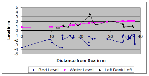 In May 17, 2003, data were collected by Hydraulics Research Institute (HRI), Coastal Research Institute (CRI) and Drainage Research Institute (DRI) for the flow and bed topography of the Edko lake-drain-Bougaz system,.1 Negative flow indicates flow is from the sea to the lake and positive flow indicates flow from the lake to the sea. Figure 5 shows the tidal water level in May 17, 2003 at Bougaz Maadia where the maximum water level reached 0.56 m while the minimum water level reached 0.2 m with a corresponding tidal range of 0.36 m. It is noted in the figure that the tidal period is about 12 hrs.