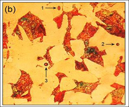 On the other hand, Figure 1b shows a microstructure identical to the one shown in Figure 1a, with a low amount of artificially added “nonmetallic inclusions” at points 1, 2 and 3. If it were the original microstructure, with real and dangerous inclusions, a wrong mechanical behavior of the steel can lead to a catastrophic failure of the piece made with it, although common people will remain blind to the subtle changes of the microstructure if it is seen as an abstract painting. In other words, for an external viewer, this almost unnoticeable change in this “artwork” is unlikely to generate a change in his original opinion about its significance.