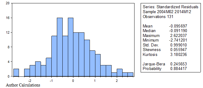 The distinguished characteristics of this model are not only that the conditional variance is a function of time but also it is the particular form is specified. Episodes of volatility are usually characterized as shocks for the dependent variance. In the regression model, a severe shock is presented by a large standard deviation. In ARCH models, the variance of the current error, conditional on the realized error, is an increasing function of the magnitude of the delayed errors regardless of their sign. p determines the length of time with which shocks persist to cause the variance of errors to be conditioned. Finally, from the normality test, (p = 0.884417), we can say that the residues are normally distributed (Figure 4).