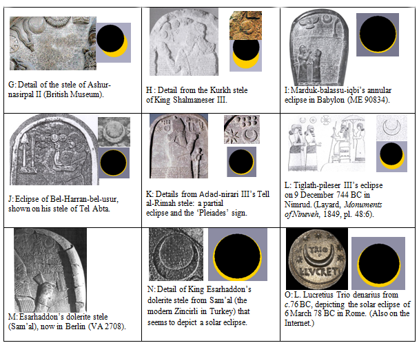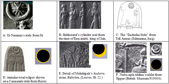 The kudurrus (boundary stones) of Melishipak and Nazimaruttash, Nabu–apla–iddina’s “Sippar Tablet” named ME 91000–91004, and a stele (ME 90834) in the British Museum,6 erected by Marduk–balassu–iqbi, all depict Babylonian eclipses of the Sun. Annular–total eclipses are quite rare and excellent for absolute dating purposes.