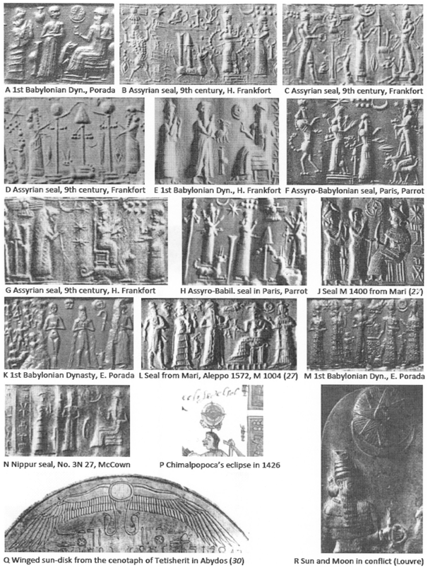 Porada et al.,1–5 published many illustrations of Old Babylonian cylinder seal impressions. Figure 2 several of those depict the Sun and the Moon in conjunction. Erich Lessing’s Photo Archive shows more amongst 2137 images by “Ancient Orient” search. Strangely, the majority of the designs depict the Sun covering most of the Moon’s disk – or its own disk – that are astronomically impossible. One can see this more clearly on a stele in the Musée du Louvre, also in Figure 2R. It can be associated this schematic symbolism with a Mexican drawing in the Codex Telleriano–Remensis on Figure 2P: “eclipse del sol – tierra eclipsada” (solar eclipse – Earth eclipsed). It shows that the sun covered part of a huge stone (the Earth or Moon) about the death of Chimalpopoca, referring to the solar eclipse of 30 October 1426 CE. In Mesopotamia, the main issue was the conflict of the Sun with the Moon, depicted only by a general symbol for eclipses. Many kings, like Nabonidus, simply copied such nice symbols used by the previous rulers. In general, depicting the darkness of a total solar eclipse may pose utter difficulties for a modern painter as well.