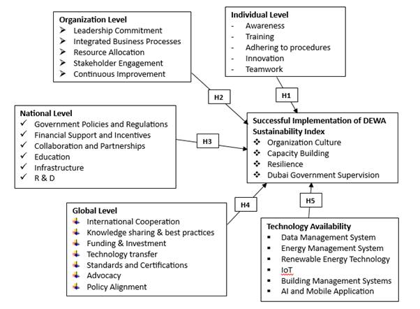 The successful implementation of the DEWA Sustainability Index within the Integrated Multi-Level Sustainability Model hinges on the seamless coordination and engagement of stakeholders across all levels individual, organizational, national, and international. At the individual level, employees play a crucial role by integrating sustainability into their daily activities, adhering to DEWA's policies, and fostering a culture of continuous improvement through collaboration and innovation. Organizational commitment is pivotal, where top management's strategic vision aligns with sustainability goals, supported by adequate resources and robust monitoring mechanisms. At the national level, supportive government policies, financial incentives, and infrastructure development are essential, creating an environment that encourages sustainable practices. Internationally, global cooperation, knowledge sharing, and access to funding and technology accelerate sustainability efforts, aligning national actions with global sustainability goals. The availability of advanced technologies, such as data management systems, renewable energy solutions, and IoT devices, further enhances the ability to track, analyze, and optimize sustainability performance. Moreover, fostering a strong organizational culture that values sustainability, investing in capacity building, and promoting resilience ensures that organizations can adapt and thrive in changing environments. By addressing these interconnected factors, the Integrated Multi-Level Sustainability Model provides a comprehensive framework for the successful implementation of the DEWA Sustainability Index, driving collective progress towards sustainability objectives at all levels.