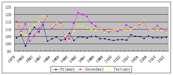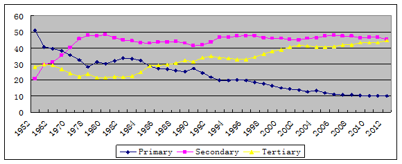 As shown in Table 2, in the early 1950s China was a typical poor agrarian country. Its primary, secondary and tertiary sectors produced 51%, 20.9% and 28.2% of GDP respectively. The secondary sector was the weakest one, in which heavy industry was even weaker than light industry. Its output was only one third the latter’s. But under the Stalinist strategy the secondary sector rapidly grew, making its share in GDP the largest (48%) in 1978, when the shares of the primary and tertiary sectors fell to 28% and 24% respectively. The secondary sector was expanded by heavy industry because 50% of China’s investment was in it. This was 5 times the investment in agriculture and 8 to 9 times the investment in light industry, so heavy industry grew from the weakest to the strongest sector. In 1978 its share in the output structure of agriculture, light industry and heavy industry became the largest (43%), and the agricultural share dropped to 25%, while the share of light industry was always about 32% and did not grow from 1952 to 1978 Pei.14 Due to the capital-intensive nature of heavy industry that attracted lots of farm surplus into it but blocked inflow of surplus labor from agriculture, the change in labor structure lagged far behind the change in the GDP structure. From 1952 to 1978 the share of industrial labor increased only by 10%, and the share of agricultural labor decreased by 13%, while the share of service labor increased a little (3%). By contrast, from 1978 to 2012 the share of agricultural labor decreased by 37%, the shares of service labor increased by 24%, and the share of industrial labor increased by 13%, so their changing paces were 3 times, 8 times and 1.3 times their respective paces during 1952-1978. This acceleration was caused by a self-adjustment of the dual economy created by the Stalinist strategy.