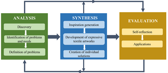 According to the review of process framework in empathy of design, co-design, and fashion and textile design, the theoretical co-design process framework for expressive textile art and fashion workshops is proposed and based on the ‘analysis-synthesis-evaluation’ concept. The framework is shown in Figure 1.