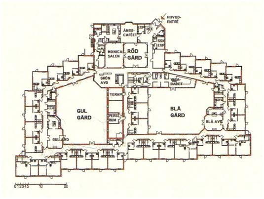 The anthroposophical group’s call for an architect resulted in a commission to Ms. Husberg, who as an architect had specialized in care architecture after a short stay at the national board for building matters. As an architect employed at renowned architect’s office in Stockholm, she was head of the architect team that won the architectural competition about the extension of the Ryhov hospital in Jönköping. In the following phase, she was chief architect for the realization of this regional hospital that yearly treats about 400.000 patients. In addition to a professional experience of care environments, Ms. Husberg also carried a personal grief of lost loved parent. This parting took place in an old hospital building from the late 19th century, where the institutionalized environment supplied a tragic backdrop to this emotional parting. Originally intended as housing for destitute and poor people, it is still standing today, demonstrating the management principle for many old buildings with municipal, regional or state owners, now serving as education building for the Chalmers University of Technology.