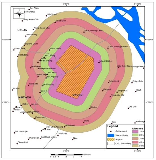 Table 3 presents the communities where the respondents were drawn. A five kilometres (5km) buffer was drawn around the Obong Victor Attah International Airport and all the communities were listed according to buffers (1km, 2km, 3km, 4km, 5km). A buffer was used to delimit the study area to enable the research study the distance decay in the area of employment. Ten percent of the communities were selected at random from each of the buffer levels. Ten percent is the minimum level for any sample to considered valid.14 The buffer map is presented in Figure 2.