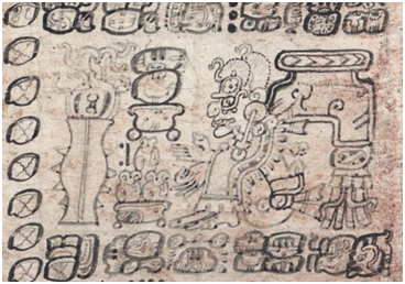 The currently preserved text corresponds to a 1779 copy that exhibits the name of Joan Canul. From comparisons with the Chilam Balam of Chumayel,2 the Book of Chilam Balam books3 and the Calkiní Codex,4 it seems that the original corresponds to a late 16th-Century unknown codex. In the Ritual, we can identify references to writing with glyphs. Therefore, we can consider that the author relied on prehispanic documents. In fact, in the text,we can read that "the glyphs will have to give us the answer" (file 48: 46-47). Unfortunately, the European conquerors destroyed most of the Mayan codex documents. Therefore, in this case, we cannot know the text, painting, or glyph referred to by the healer in this fragment. To exemplify this type of interaction, in the following images, from the Dresden Codex, we can observe deities or persons that interact. They are surrounded by glyphs, which possibly serve as a support to complement oral expression. In image 1, we can appreciate the interaction with an animal representation, and in Image 2, maybe a healer is preparing his requirements for the ritual, mainly herbs, and animals. Both images include morphosyntactic, grammatical, and numerical glyphs. Undoubtedly, the reading of this codex and its possible interpretations implies relevant research for specialists. Ritual language involves linguistic, lexical, semantic, and rhetorical resources, as well as multiple interpretative possibilities that respond to the communicative and contextual functions in oral tradition. In the spells, we can appreciate ritual repetitive phrases, dialogical evidence through questions, answers, and imperative inquires in the interaction between the priest and his interlocutors: the spirit of smallpox and other deities involved. The symbolic language involves the context and polysemy in certain words and translations that correspond to Mayan religion and mythology concepts. We can identify symbolic meanings in the personification of deities and spirits involved.