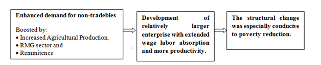 Thus from the above it is obvious that within the 1990s three economic groups contribute to the economy most: Firstly, the farmers, with their increased production; secondly the garment workers along with their families and; at last the families that are benefited by the remittance flow. These all three group helps the accelerated growth of non-tradable growth. However these three groups experience the positive impact of the globalization throughout that time. Global free market helps the garment sector to boost up. On the other hand more people are going to abroad though globalization process and contribute a significant amount of remittances in the Bangladesh economy. Ease in the import regulation through free market helps the agro-sector to import fertilizer, technology to the local primitive cultivation system which boost helps to boost up the agro production system. Thus Globalization plays a key role in this regard.