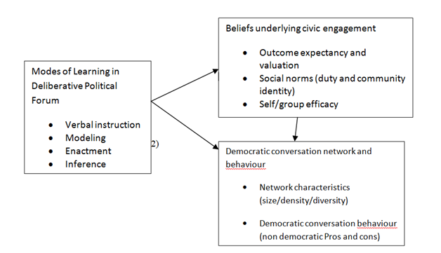 The above cognitive model of political education demonstrates that fruitful deliberative experience through verbal interaction, modeling, enactment or inference could boost participants’ political outcome valuation because of positive feelings participants often derive from sincere dialogue. As a result of a successful deliberative experience, participants might develop more positive expectances, self-efficacy, and group efficacy regarding political engagement and participation. Besides, public deliberation on political matters between the citizens and the fellows on one hand and the citizens and the socializing agent on the other hand, models democratic behavior and provides participants with the opportunities to practice that behavior.