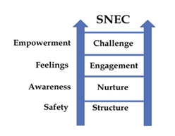 On this topic, the Relational Care Ladder28 is an applicable model that illustrates the above. It is a model dependent on the active establishing of structure and boundaries. Although Rundell28 develops this model as a way to intervene with youth that have experienced trauma, it is useful to consider it as part of building a restorative culture based on critical and transformational pedagogies. This model can guide the work with teachers and youth leaders to empower them to also follow it on their conversations with adolescent boys. Nurturing conversations that foster awareness about the student’s rights and responsibilities are fundamental. Teachers engage the learning community in a social and emotional way by incorporating feelings in ways that are horizontal.29 Expression of feelings is encouraged through engagement and teachers empower youth by challenging the person to take actions. This is illustrated through the acronym SNEC (Structure, Nurture, Engagement, Challenge) (Figure 1).