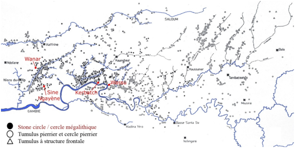 The Senegambian megaliths zone is located in the westernmost part of West Africa, in Senegal and the Gambia. The Gambia and Saloum rivers, 120 to 150 km apart. mark its southern and northern boundaries (Figure 2). It is stretched over 250 km west–east, approximately from the cities of Kaolack to Tambacounda.3–7 The area measures some 33,000 km2 with megalithic monuments concentrated along water courses (Figure 2). They attracted scholarly interest as early as the end of the 19th century, with sustained research efforts during the Colonial period.8–10 Captain Duchemin & Jouenne P8,11 were two of these pioneers who devoted their activities to the search for the Senegambian megaliths builders. In 1903, Captain Duchemin8 excavated two monoliths circles at Dialato in Senegal. Taking notice of the unusual arrangement of human remains, he suggested the possibility for the practice of secondary burial.12,7 From 1915 to 1930, Jouenne P11 a medical doctor, explored the central part of the megaliths zone, excavated 15 monuments in six different sites, and developed an elaborate and intriguing theory to account for the existence and structure of the monuments he has investigated. For Jouenne13 Senegambian megaliths are but another facet of an ancient solar religion, the “Sun Worship”, geared to structure the spiritual life of ancient farming communities and fulfill the requirements of the agricultural cycle.