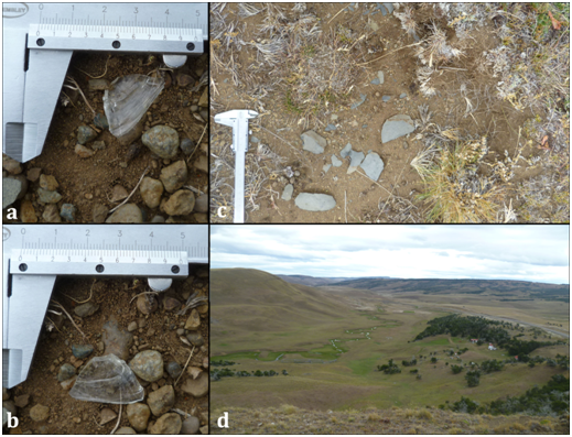Figure 2 Ea. La Escondida site: (a) Dorsal and (b) ventral faces of the glass flake; (c) lithic assemblage on locally available shale; (d) location and view to the Guillermo river valley.