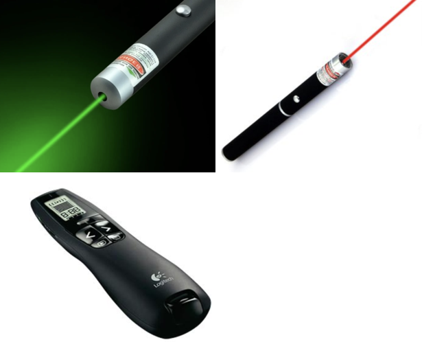 With a flat-screen powered by LED lamps, laser pointers appear with a green light because the red light is not visible on those screens (led powered screen) (Figure 8). The laser pointers are part of the dispositive named “presenters”, including the laser beam and a powered radio system for changing the slides at a distance. The newest presenters include the option of blanking the screen when the speaker wants to catch the interest of the auditorium over himself. Other presenters include many computer controls and are closer than a mouse because the operator can activate other actions of the software.