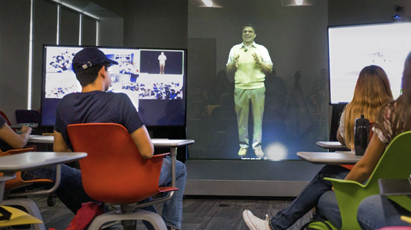 There are experiences of education institutions using holograms to “transport” the presence of a teacher to a remote location. The students can see the figure of the teacher (complete body), listen to him and interact with the hologram in real-time. The teacher has access to the auditorium, and they can see the student that is asking. The system is relatively new (2018) but is in the process of development. There are references to competencies holograms to teach Physics in Mexico.3 (Figure 10).