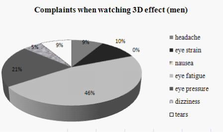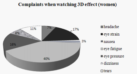 The questionnaire found out that people who have not seen 3D movies/animations complain when watching 2D movies. This group of people contains 4% of all respondents. It leads to an assumption that 3D cinema is not the only reason that cause complaints and discomfort when watching 3D movies. It depends on every subject vision and health condition. Some people notice winking of polarizing glasses, it can cause headache and dizziness. It is also important to learn how to watch 3D movies. For many people it is not clear where to focus during 3D movies. It causes problems to see 3D effect at all. During the movie the focus must be simultaneously on the background and on the objects which fly out of the screen. One of the problems is also the length of the movie. For instance, if we compare “Spy Kids” and “Avatar” the 3D effect lasts for some minutes in “Spy Kids”, but for 2 hours in “Avatar”. It forces people to watch movie in artificial circumstances. In Great Britain “The Eye Care Trust” made a research among inhabitants and found out that 6 million people do not see 3D effect due to binocular vision disorders.11 American Optometrist Association claims that approximately 3-9 million people have problems to see 3D effect properly (American Optometrist Association, 2011). In our research we found out that 18% women and 15% men have difficulties to see 3D effect. It shows that they have possible binocular vision problems. Some respondents claimed that it is difficult to put 3D glasses on their own vision correction glasses. The inability to see 3D effect could be related with lazy eye, astigmatism, different refraction in both eyes, anisometropia, squeezing.