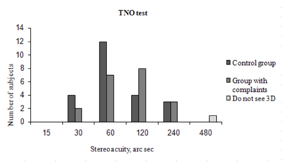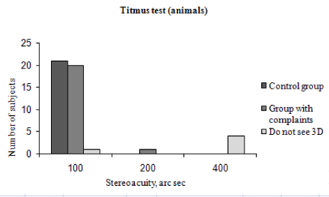 The most common complaints when watching 3D cinema are eye fatigue (46%), sensation of eye pressure (21%), eye strains (10%) etc. (Figures 3 & 4). In a research which was carried out by American Optometrist Association it was established that 13% suffer from headache, 12%-from blurry vision and 11%-from dizziness.8 Information about 3D movies/animations was gained from cinema “Citadele” IT manager Maris Misevics. Among movies the respondents had seen the only movie made on anaglyph method was “Spy Kids”. 13% of respondents had complaints relating to it. Other movies included in the questionnaire were made based on polarization. Those movies were: “Avatars” complaints by 51% of respondents, “Step Up”- complaints by 30%, “Adventure at the center of the Earth”-complaints by 23% respondents. Comparing results of three groups, the best results gained the control group. It was a group which did not have any complaints when watching 3D movies. The average stereoacuity in a distance of 5.20 meters was 642 arc seconds. The average stereoacuity in TNO test was 89 arc seconds, in Titmus test (circles)-51 arcs second and in Titmus test (animals)-100 arc seconds. In the second group 21 participants, had complaints when watching 3D movies. The average stereoacuity in a far distance was 641 arcs second, in TNO test-108 arc seconds, Titmus test (circles)-69 arc seconds and Titmus test (animals)-105 seconds (Figure 5d).