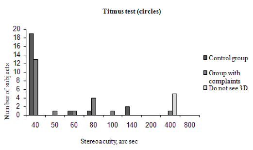 The results of the research were compared with the research carried out by Fawcett and Birch about Titmus and Random-dot test validity examining children with binocular disorders. 170 children with a good stereo threshold and with undeterminable stereo threshold took part in the research. Titmus test (circles) and Random-dot test showed similar results-160 arc seconds and even better. It was established that the results must be interpreted carefully, because a person who sees monocularly may gain a very good results.9 The results were also compared with the research carried out by Garnham and Sloper about changes in steroacuity with age. There were different stereotests used, including Titmus and TNO. 60 subjects took part in this research ranging from 17 to 83 years. It was established that remarkable decrease of stereoacuity (in TNO test) was for 5 subjects which average age was above 55 years. But in Titmus test the stereoacuity of those subjects was much better.10