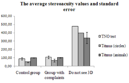 In the third group 7 participants did not see the 3D effect. In a polarized test, some of them affirmed that they saw a point and two stripes, but they did not have a spatial sense-nothing was coming out of the plane. In every case the point was aberrant to one side-left or right side. Thus it was necessary to check if a participant uses binocular vision during the test. It was not possible to define the average value of TNO test results, because only one person could see spatial (in this case 480 arc sec, which is the lowest result of the test). In a Titmus test (circles) the average stereoacuity was 400 arc seconds, but in a Titmus test (animals)-it was 340 arc seconds (Figures 6 & 7). Comparing the average stereoacuity values and standard errors among three participant groups (Figure 8). The highest numerical results have the group who does not see 3D effect; the control group results are numerically lower. Standard errors are higher for the group who does not see 3D; however, in a TNO test only one participant gave an answer, therefore it is not possible to obtain standard deviation and standard error. The difference between standard errors could be explained by the difference of number of measures. Control group involved 23 measures, but the group who did not see the 3D effect involved only 7 measures. If there would be more measures, the standard error would be lower.