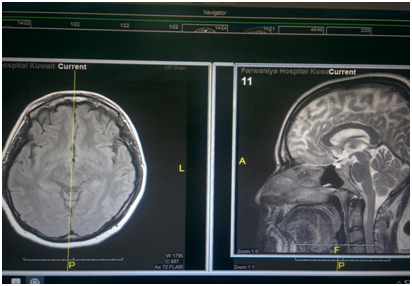 A 28 years old female patient, who was 27 weeks pregnant, had a syncope followed by noticing vertical binocular diplopia. On examination, the patient had impaired elevation which was asymmetrical being more on obvious on the right side, retraction nystagmus, and pupillary light-near dissociation in both eyes. Otherwise no other focal neurological deficits were detected. MRI and MRV showed no abnormalities. While an MRI with contrast revealed a focus measuring 4X8mm of altered MRI signal at the superior para-sagittal region in the right half of the midbrain. (tegmentum) just below the thalamus with no perifocal edema or mass effect, denoting being ischemic in nature. All blood tests were within normal limits, and her coagulation profile was within normal limits (Table 1). The cause of that ischemic lesion couldn’t be identified, but a planned CTA will be carried out after her delivery (as an elective c-section) to identify any vascular abnormalities. Until then, the patient is kept on oral aspirin (Figures 1 & 2).