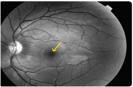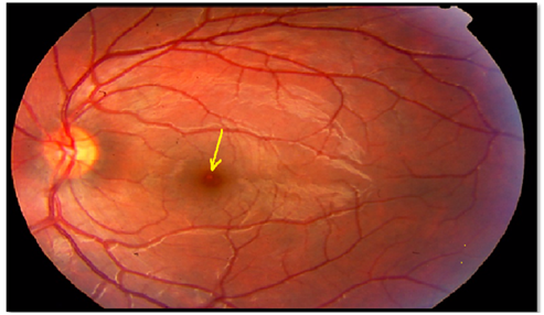 A 16-year-old boy was referred to our out-patient clinic. He was complaining of a central black spot in his left eye. The patient was directly exposed to the beam of a class IIIA green laser pointing device about a month ago. He has starred for 3-6 seconds to light beam. The device was used as toy pointer with the maximum power rating of 50 mv and wavelength of 532±10 nm. He flashed the laser light from the distance of 25 mm away from Cornea and gazed only one time to the light. The patient’s history revealed no visual complaints, prior to this event. Clinical examination revealed visual acuity correctness of 10/10 in the right eye and 10/10 in the left eye. Anterior segments of the both eyes were intact in the examination. Fundus examination showed a yellowish dot lesion in fovea of the left retina (Figure 1).