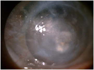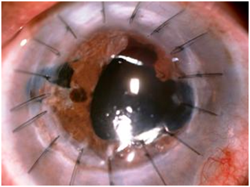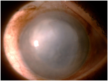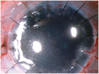 A 77year old Female patient presented to us with gradual diminution of vision in both eyes. One year back, she underwent left eye Penetrating Keratoplasty (PK) for Pseudophakic Bullous Keratopathy (PBK) but her vision failed to improve. Her Best corrected visual acuity (BCVA) was +1.30 LOGMAR in the right eye and +1.77 LOGMAR in the left eye. Slit lamp biomicroscopy revealed PBK in the right eye (Figure 1), and Graft failure in the left eye (Figure 2). We planned for corneal re-grafting in the left eye and primary PK for the right eye under guarded Prognosis. On patient’s request as the donor was her twin sister, she was taken up for simultaneous bilateral PK. A written informed consent was taken from the patient and attenders after explaining the risks, complications and prognosis of the surgical procedure. Donor corneal buttons with endothelial count of 2982 cells/mm2 and 3108cells/mm2 were harvested from both eyes of her twin sister and bilateral PK was done successfully. Intraoperative period was uneventful. It was bilateral surgery with scrub in between with two different instruments.