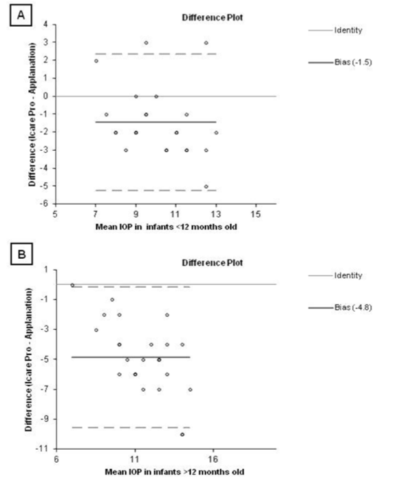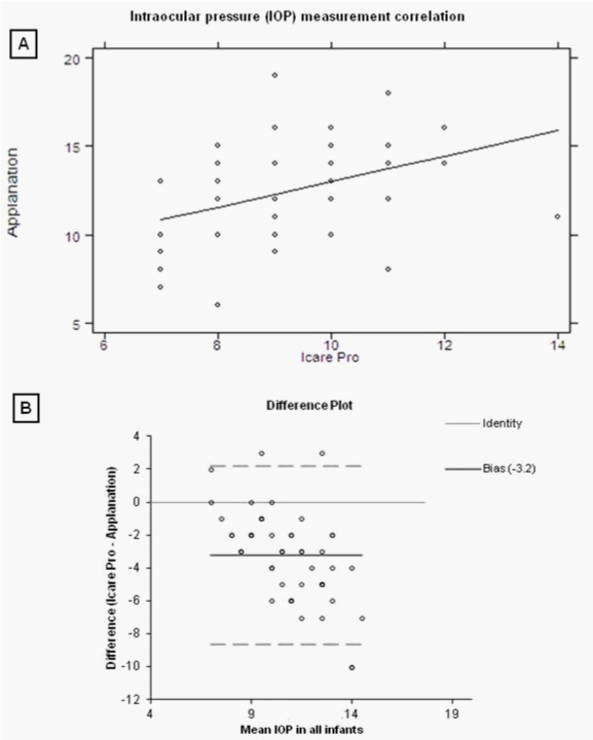 The order of the IOP measurement was alternated between ICPRO followed by PAT and PAT followed by ICPRO. Significant distress observed as crying experienced during IOP measurement was noted. The means and standard deviations of the IOPs measured by both tonometers were compared. The Bland-Altman plot was used to compare the bias and 95% limits of agreement between the ICPRO and PAT measurements. In the Bland-Altman analysis the difference between each IOP measurement was plotted against the mean. Linear regression of the Bland-Altman analysis showed whether any overestimation or underestimation of IOP had arisen within the measured range. All statistical analyses were performed using Analyse-it for Microsoft Excel, Cambridge, UK.