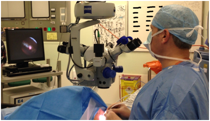 The probe consist of a Xenon light source, a fibre optic video cable, a visible aiming beam from a Xe-Ne laser and the laser itself, an 810nm wavelength diode laser (Figure 4). The laser is operated via a foot pedal. Because of the increased risk of a brisk uveitis, including a fibrin dump, all patients receive intra cameral dexamethasone 0.2ml (0.8mg)-drawn from intravenous dexamethasone preparation 4mg/ml at the end of the procedure after the standard intracameral Cefuroxime 0.1ml (1mg). Two hourly topical steroids and 4x daily antibiotic drops are prescribed. The first follow-up appointment is 1 to 3 days post procedure with the main aim of ensuring that fibrin dump or pressure spikes are identified early. Pressure spikes are treated with a paracentesis ‘burping the wound’ with repeat pressure check in 24 hours. Fibrin dump is treated with subconjunctival dexamethasone (4mg in 1ml) and reviewed in 2 to 3 days. The vast majority of eyes in this series required no intervention and the two hourly drops are reduced to 4x/day and stopped 4 weeks later (5 weeks total). Patients were told to stop all glaucoma drops in the operated eye until review.