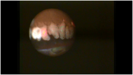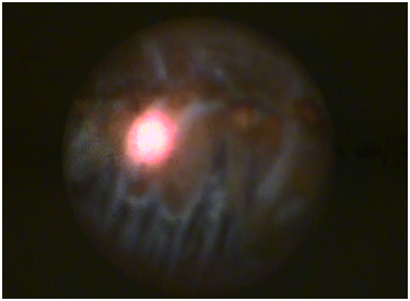 Indications for performing the surgery are progression of glaucoma on maximum tolerated topical treatment with co-existing cataract inability to tolerate or instil glaucoma drops (elderly,tremor,dementia,arthritis etc) and co-existing cataract. The endo-cyclophotocoagulation is usually performed towards the end of the procedure either after insertion of the IOL or immediately prior to this. The most important aspect to bear in mind whilst performing the procedure is to avoid any contact with the iris as this usually results in a very brisk uveitis with fibrin dump postoperatively. Always ensure the sulcus remains fully inflated with visco-elastic and always remove all the visco-elastic from the bag first at the end of lens implantation as this will allow a much fuller view and treatment area of the ciliary processes. The main corneal incision is used to insert the laser probe into the anterior chamber after inflating the ciliary sulcus with visco-elastic. The probe is advanced forward under the iris and pointing towards the ciliary processes. The laser, which is not in the visible spectrum, has a guiding Xe-Ne beam. The laser is set to ‘painting’ mode allowing a continuous ‘painting’ of the ciliary processes whilst the effect of the treatment is observed on a monitor adjacent to the operating table showing the view through the fiber optic video cable of the laser probe (Figure 1). The operating microscope is only used in order to visualize the insertion of the viscoelastic and a safe insertion of the laser probe. The effect of the laser on the ciliary bodies is a visual change in the shape and colour of the processes. They shrink and turn from a brownish colour to white in eyes without pseudo-exfoliation (PXE) (Figure 2). There is a marked difference both in the visual appearance as well as the reaction to the laser in patients with PXE with minimal shrinking and colour change (Figure 3). The author enlarges the side port used in the phacoemulsification to allow for a full 360 degrees treatment.