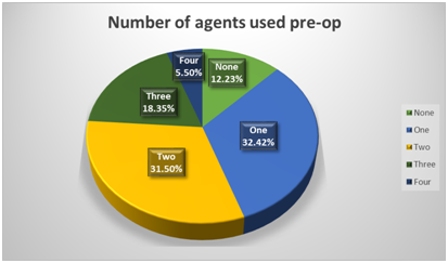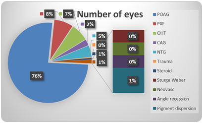 The study included 328 eyes of 207 patients. The mean age of participants was 78.8 [SD +-10 years, range 62-100]. The group consisted of 53% males and 48% females. The longest follow-up was 48 months. The mean follow-up period was 24 months. 154 eyes were followed up for 12 months and 105 for 24 months or more. The glaucoma subtypes included were as per (Figure 5). Pre-operatively, patients used a mean of 1.72 agents [SD 1.07, range 0-4] and pre-operative IOP mean was 17.1 [SD 5.3, range 15-41]. See also the attached charts for number of drops used and overall IOP change over time in (Figures 6−9). The overall reduction in IOP at 24 months was 24.0% and the overall reduction in the number of agents used at 24 months was 38.0%. See (Table 1&2) for details. As expected with destruction of ciliary epithelium, the documented complications are all related to increased inflammation (Table 3). All complications resolved without sequelae. Intracameral steroid and intensive drops in the first week is crucial to ensure smooth recovery. Further surgery was required in 12 eyes (3.6%) and consisted of 9 MMC Trabeculectomies, 2 Ahmed valve implants and 1 external cyclodiode laser.
