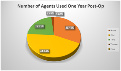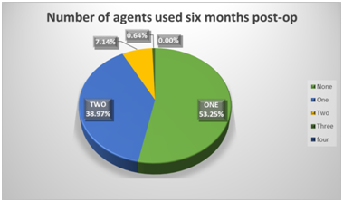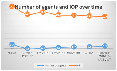 Table 1 Overall view of number of agents and IOP over the time of follow up. At every time point from surgery we have annotated the number of eyes followed up for this length of period. p<0.05 at all time points using the t-test