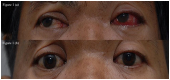 Figure 1 (a) photograph taken pre-treatment showing left eye conjunctival injection and chemosis (b) photograph taken post-treatment showing complete resolution of conjunctival injection and chemosis in the left eye.
