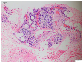 Patient was co-managed with the department of haematology and oncology to rule out systemic involvement. Further biopsies were conducted and they took samples from his cervical lymph nodes and bone marrow. His lymph nodes had evidence of marginal zone B-cell lymphoma and suggestion of secondary nodal involvement of an extra-nodal mucosa-associated lymphoid tissue (MALT) lymphoma (Figure 3 and 4; lymph node histology). His right posterior superior iliac spine bone marrow biopsy was also consistent with B-cell lymphoma infiltrate. There were generalized lymphadenopathy from skull base to inguinal region together with bilateral renal hilar soft tissue infiltration noted on computed tomography of his chest, abdomen and pelvis consistent with the diagnosis of Non-Hodgkin lymphoma. An upper gastrointestinal tract endoscopy was also performed and revealed no gastrointestinal involvement.