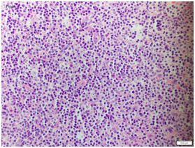 Figure 3 Lymph node biopsy: High magnification image highlighting effaced nodal architecture. The predominant small ‘B’ lymphoid cells show monocytoid, centrocyte-like and few plasma cells (Hematoxylin and Eosin, 100X).