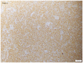 Figure 4 Lymph node biopsy: Immunohistochemical stain of lymph node shows diffuse immunoreactivity for ‘B’ cell marker (CD20, 40X).
